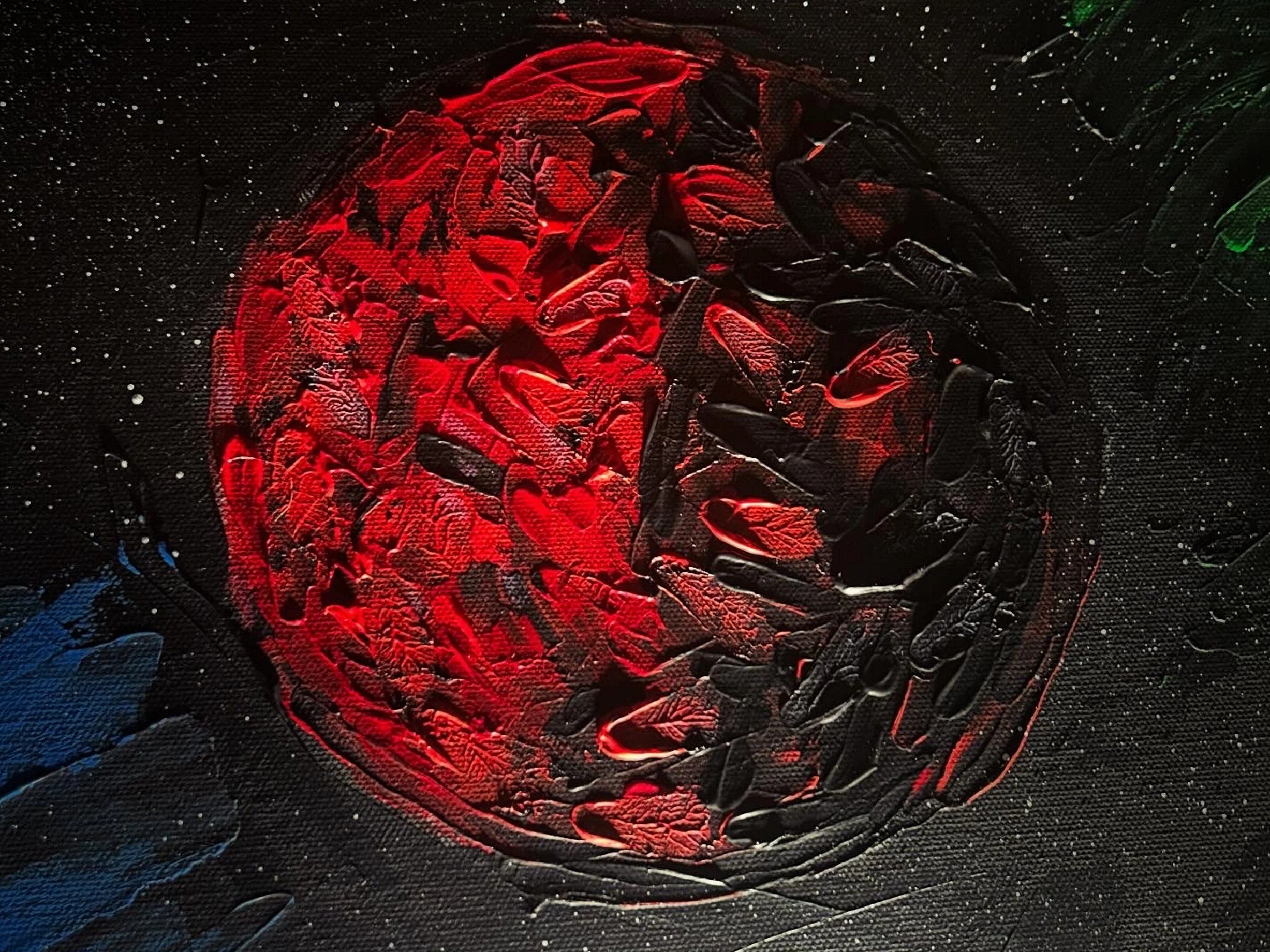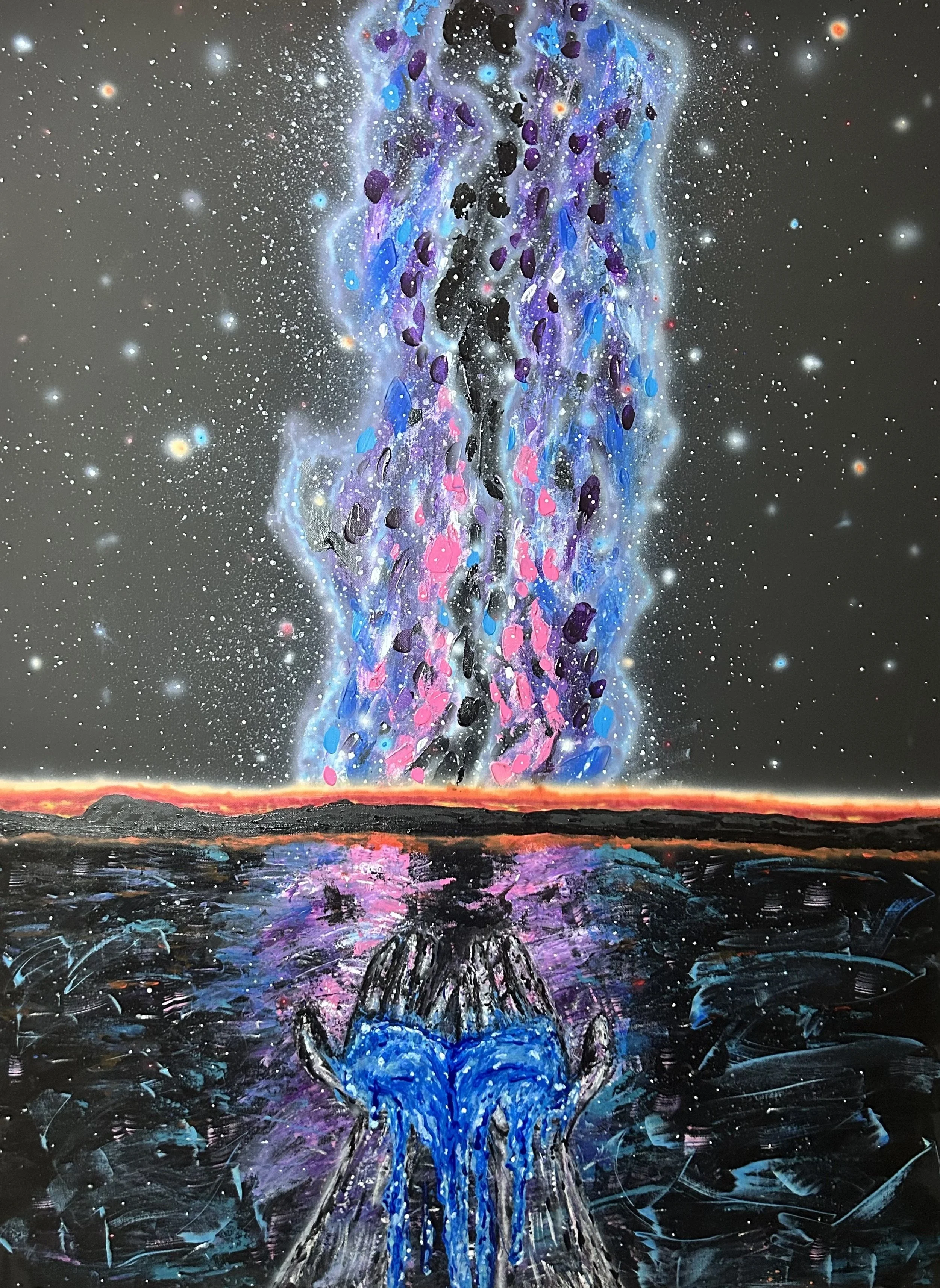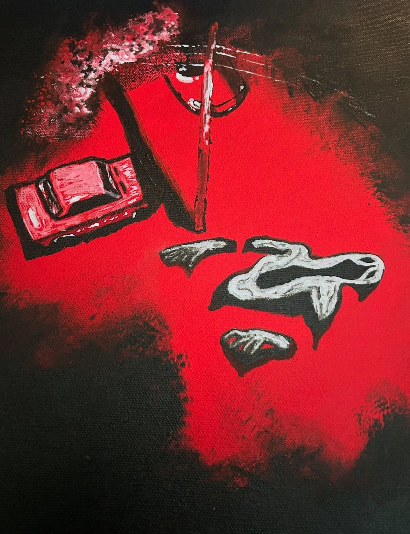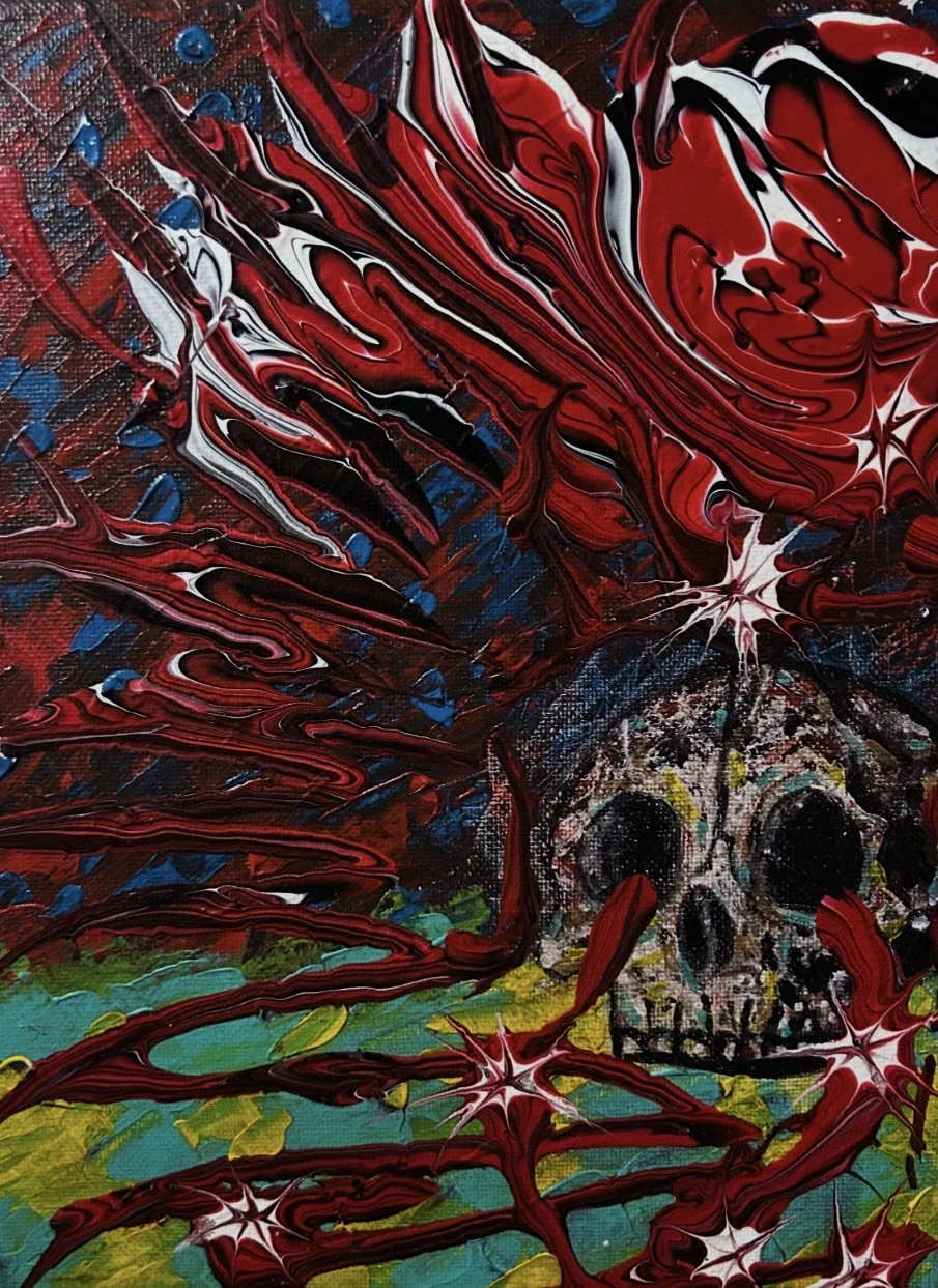 This is how the piece looks now, forever changed by the events of the story. I’ve muted the colors and added red/white/black flow paint on top of the image. What has been done can not be undone. If you are experiencing suicidal thoughts, help is available. You are not alone. Ever.