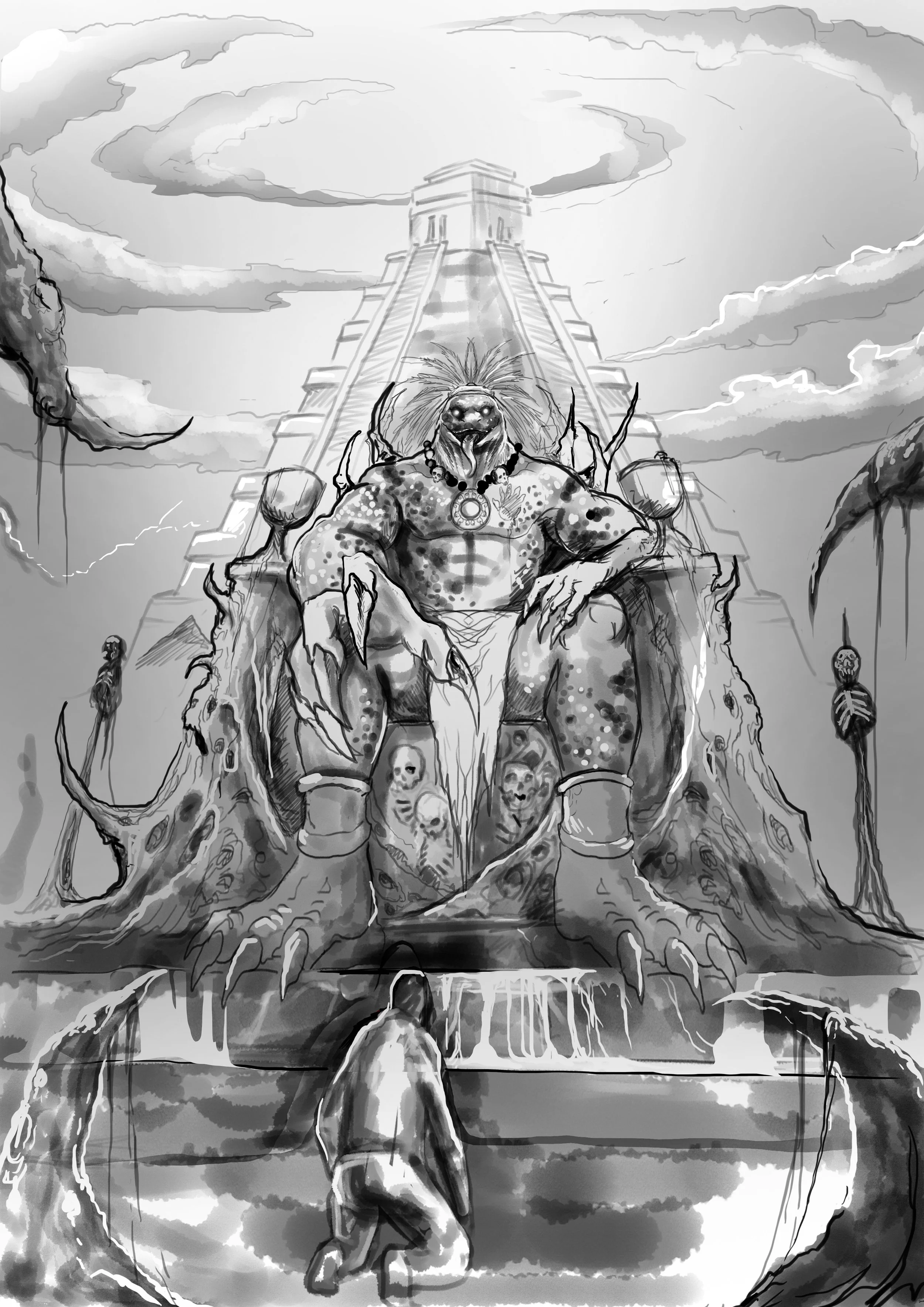 Additionally, the tabletop war game Warhammer 40K and its fantasy companion game Warhammer: Age of Sigmar lore (Khorn and the Seraphon) inspired the creation of Urochok. The songs "Blood for the Blood God" by Death Valley Knights, "Blood for the Blood God" by Gunship and HEALTH, and "Gats" by Susumu Hirasawa were on repeat during my brainstorming process while creating the work.