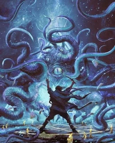 Blood flowed down Mr. Thrun's belly chin as he twisted at the hips to make eye contact with Dr. Blythe. Meredith covered her mouth as the center of Mr. Thrun's enlarged chest opened up to reveal a massive glowing blue cyclopean eye. The pupil of the eye darted around the room, as if the entity it belonged to had been asleep and was only now awakening to scan its surroundings. Then, the eye stopped and focused directly on Meredith. The belly maw curved into a twisted smile. It began to speak directly to her in a vile and hideous otherworldly voice.